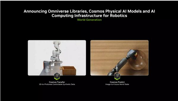 世界生成(World Generation): 利用Cosmos Transfer模型,可以将3D模型转换为照片级的可控合成数据,极大地丰富了训练数据;Cosmos Predict则能从图像中预测未来世界状态,帮助AI进行前瞻性决策。