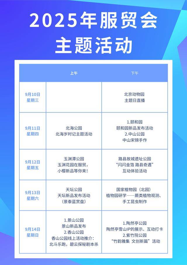 服贸会期间,市公园管理中心将为现场观众“复刻”园内的时令文化活动,持续带领大家“乐享空间”。国家植物园围绕植物研学教育,推出以昆虫、植物为主题的体验活动,由专家带领观众制作植物手作、昆虫标本等手作。北海公园推出手工香囊制作体验,观众通过选取艾草、藿香、香茅等纯天然香料调配制作独家香包。路县故城遗址公园面向公众开展沉浸式汉文化体验,通过“锡纸浮雕”创意课再现汉代錾刻工艺。更多活动安排可参考畅游公园公众号。